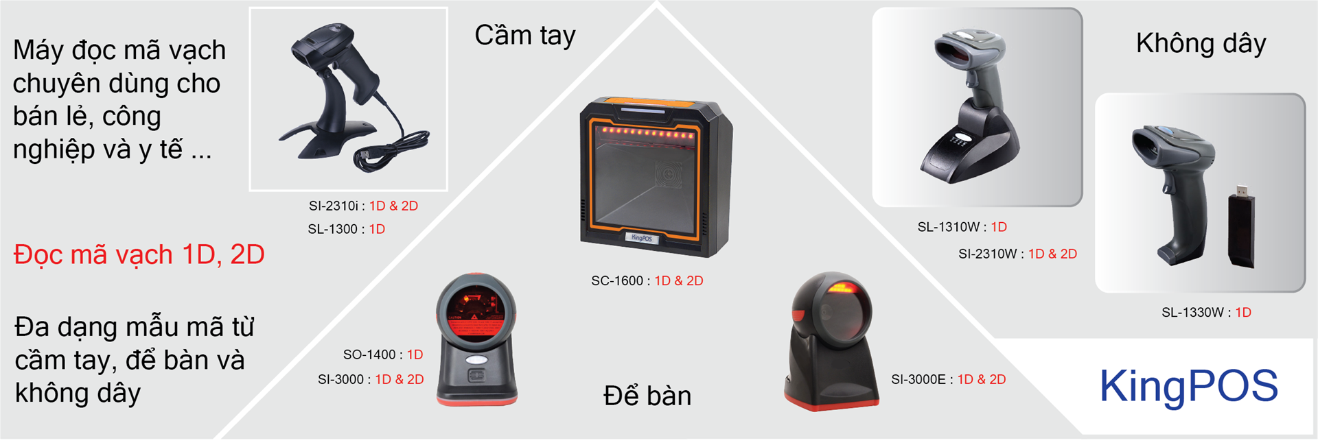 KingPOS SI-3000E là dòng máy đọc mã vạch 1D & 2D. Máy đọc được tốt mã vạch 1D và 2D, đọc được mã vạch trên màn hình điện thoại, mã vạch thẻ BHYT. Máy. Máy được sản xuất số lượng cực lớn cho thị trường Ấn Độ vì vậy có giá thành thấp. Là lựa chọn tuyệt vời khi lực chọn dòng máy đọc mã vạch 2D để bàn.