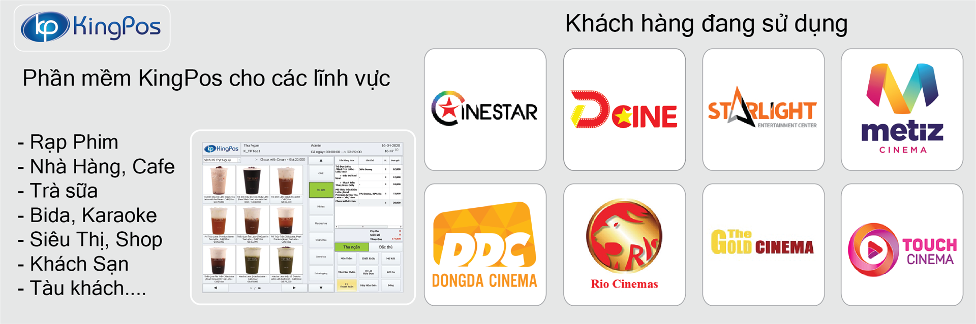KingPos for Ticket là phần mềm quản lý chuyên nghiệp cho rạp phim với đầu đủ các module : Bán vé cho máy POS 2 màn hình, Showtime, Fast Food, Lịch Chiếu...Phần mềm KingPos với đầy đủ tính năng quản lý rạp phim không thua kém phần mềm nước ngoài. Nhưng lại có những chức năng sử lý thông minh và linh hoạt hơn phần mềm nước ngoài
